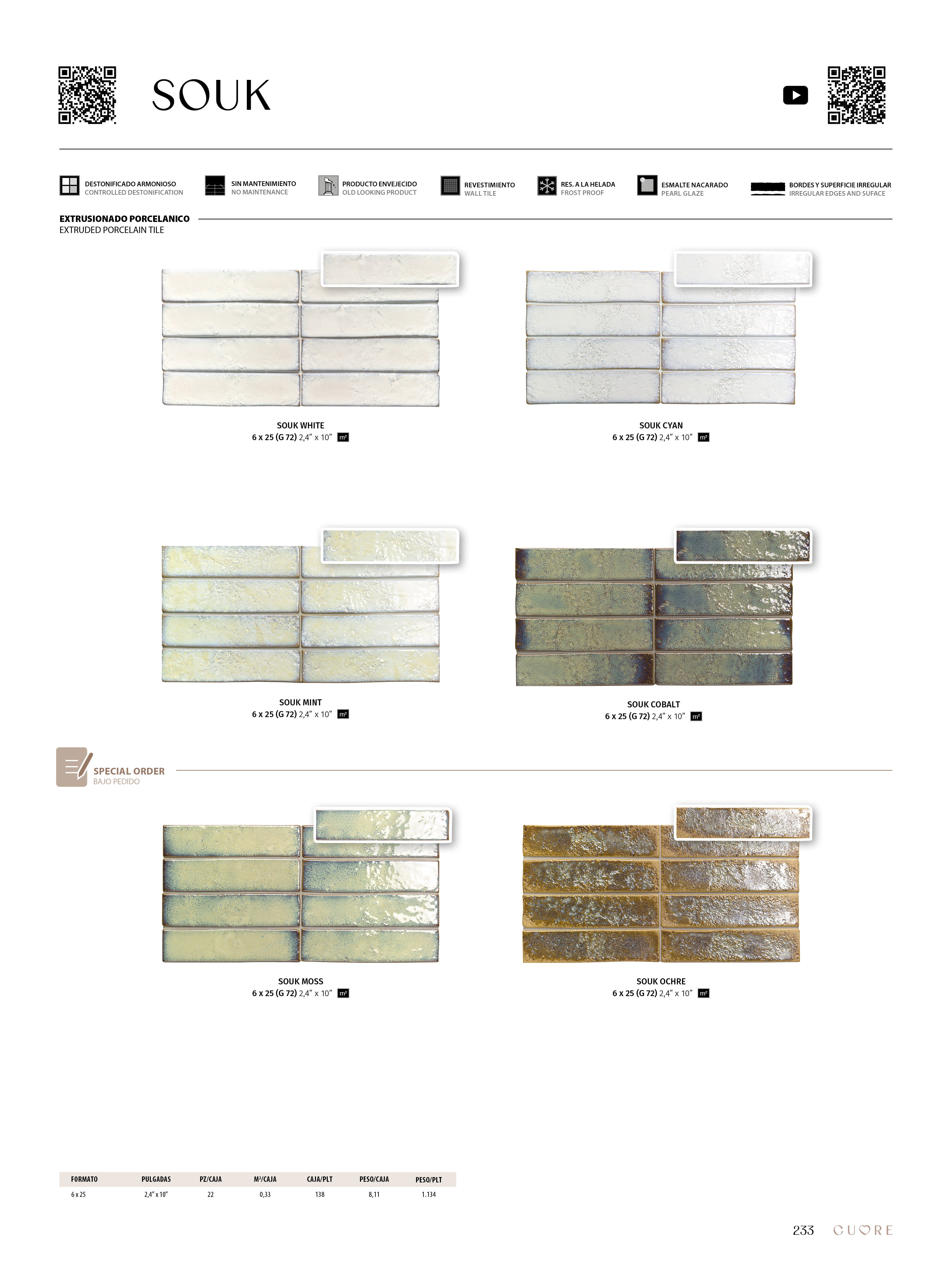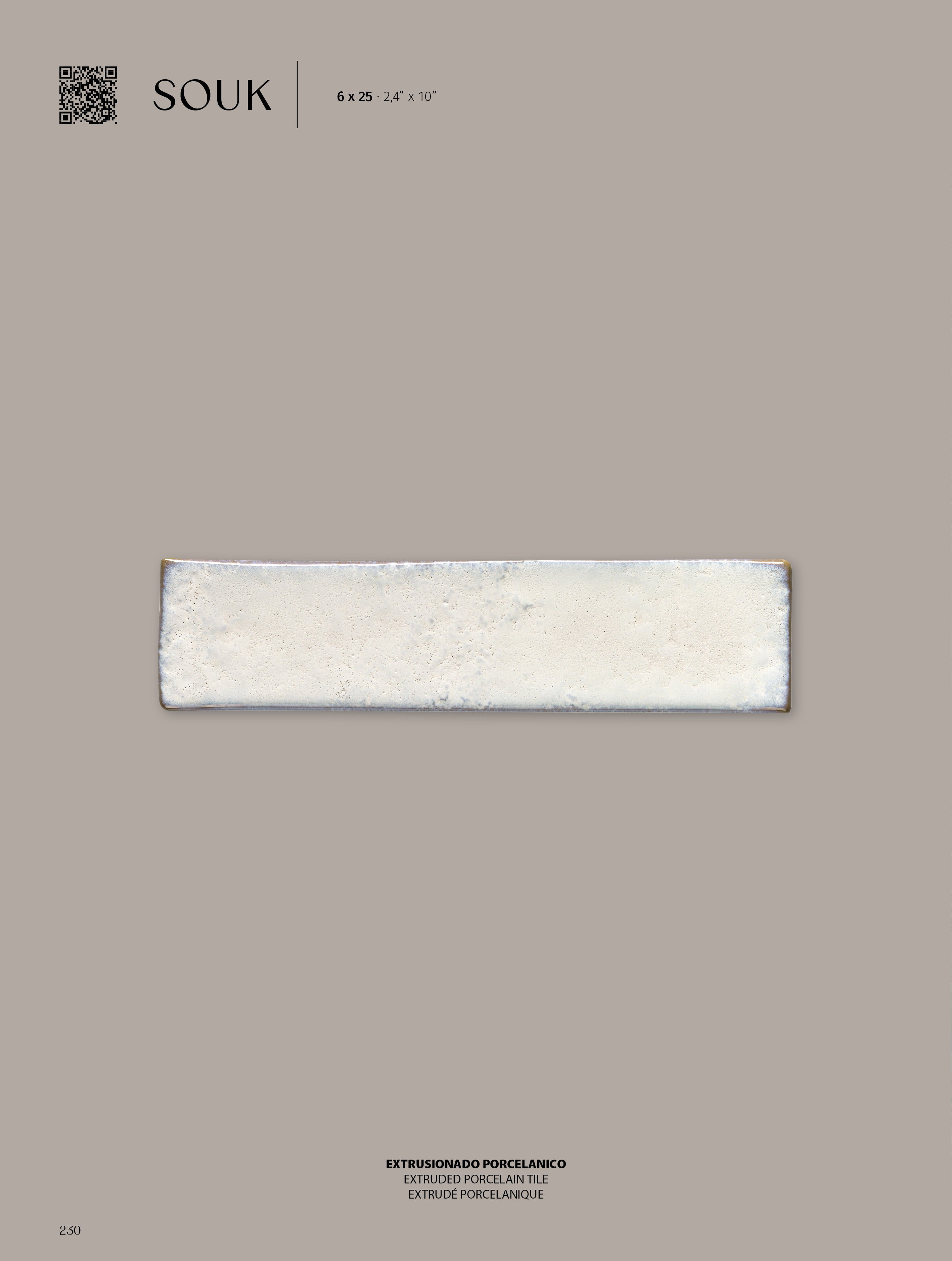 The SOUK collection offers an extruded porcelain tile in a 2"x10" format, where each piece is unique, designed to add character and authenticity to any space with its metro tile style. Its reactive glaze and delicate aged effect evoke the charm of handcrafted tiles, making it a sophisticated and versatile option for creating stylish, personalized environments.