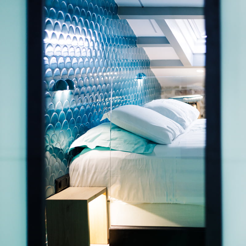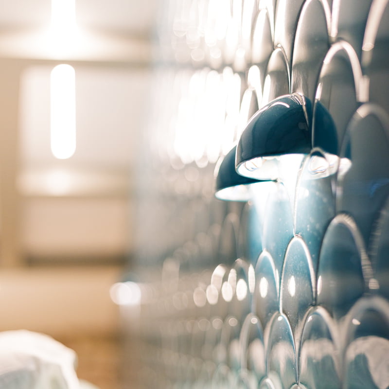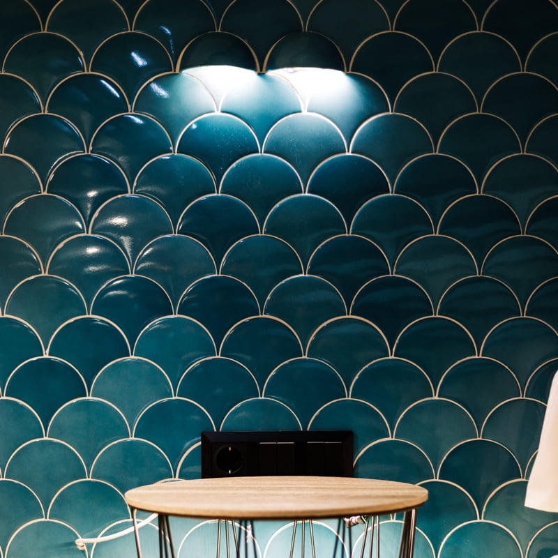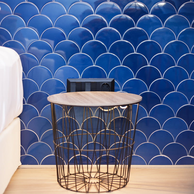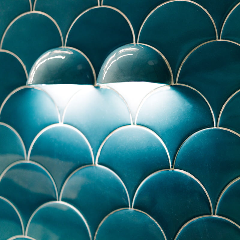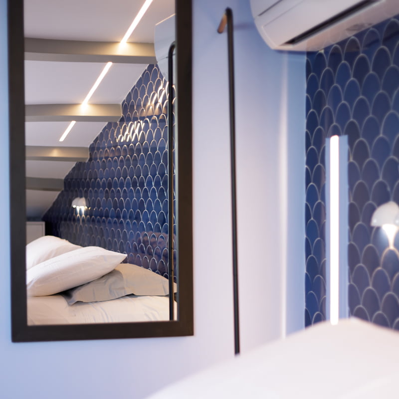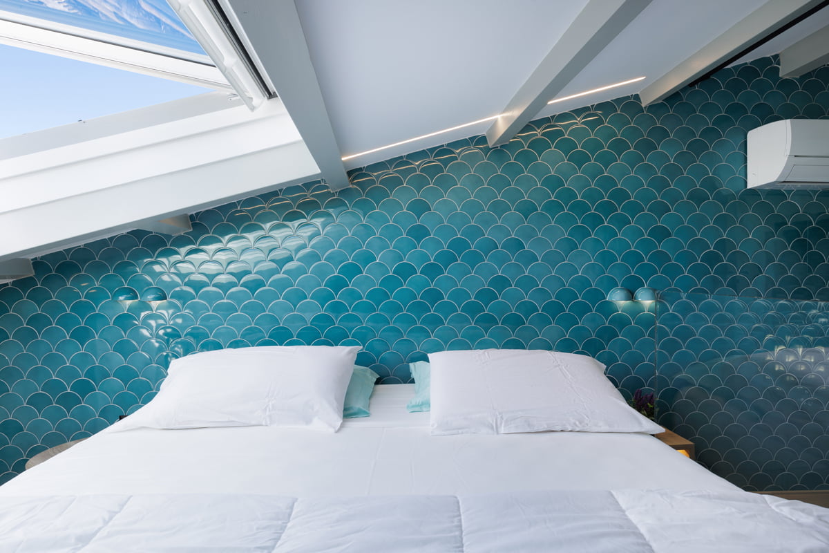 For the Vailato Loft Suites project, luxury apartments located on the island of Corfu (Greece), the Squama Indigo and Emerald series have been used, characterized by their flake shape and blue tones with maritime connotations inspired by the Mediterranean basin. In addition, the use of LED lights in the Box Luz 5"x2,5", a three-dimensional concave-shaped piece, generates a unique aesthetic continuity. And for the bathrooms, the Piastrella Mix series has been used, a white paste cladding with irregular edges and surfaces that provide a handcrafted appearance giving personality to the spaces.