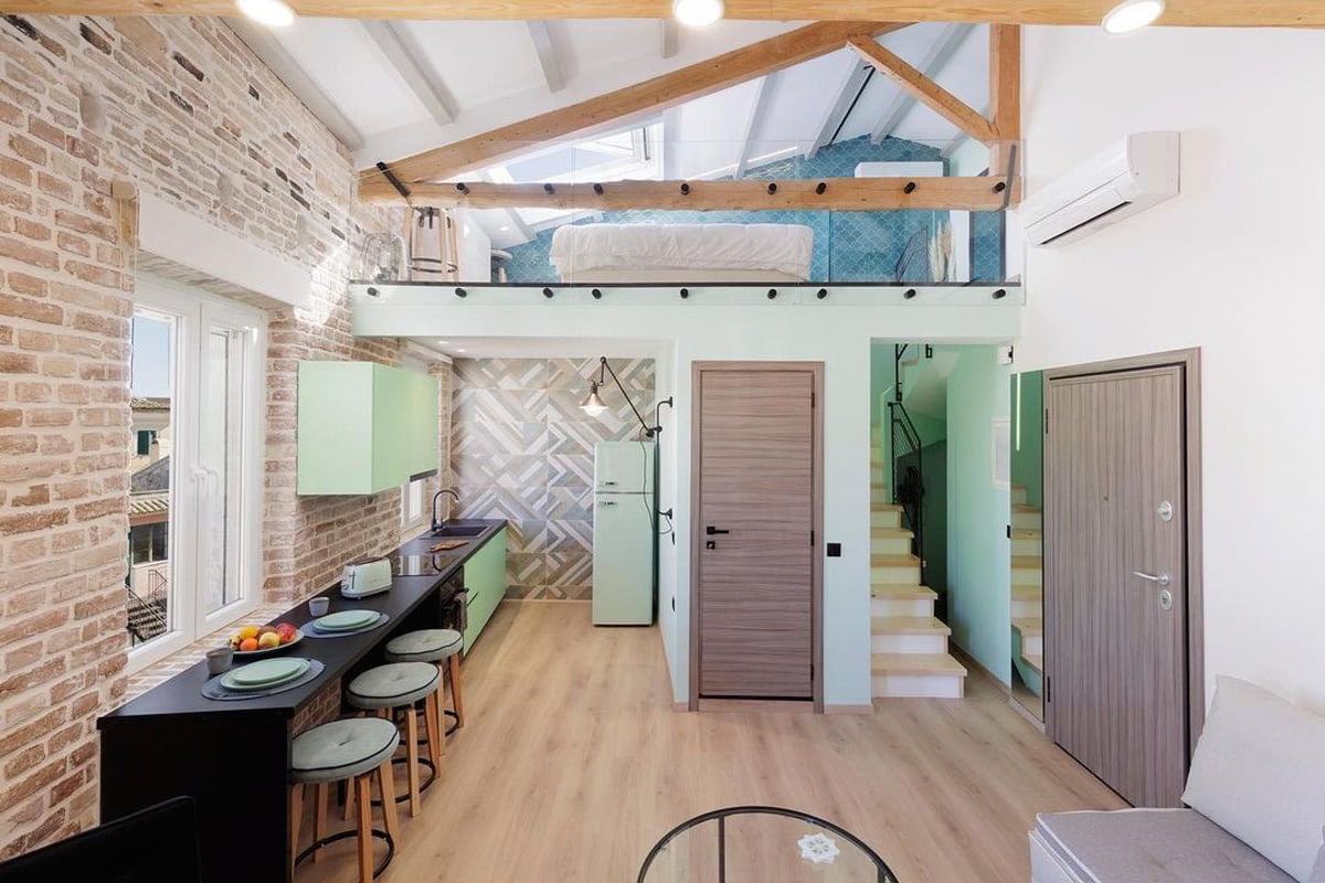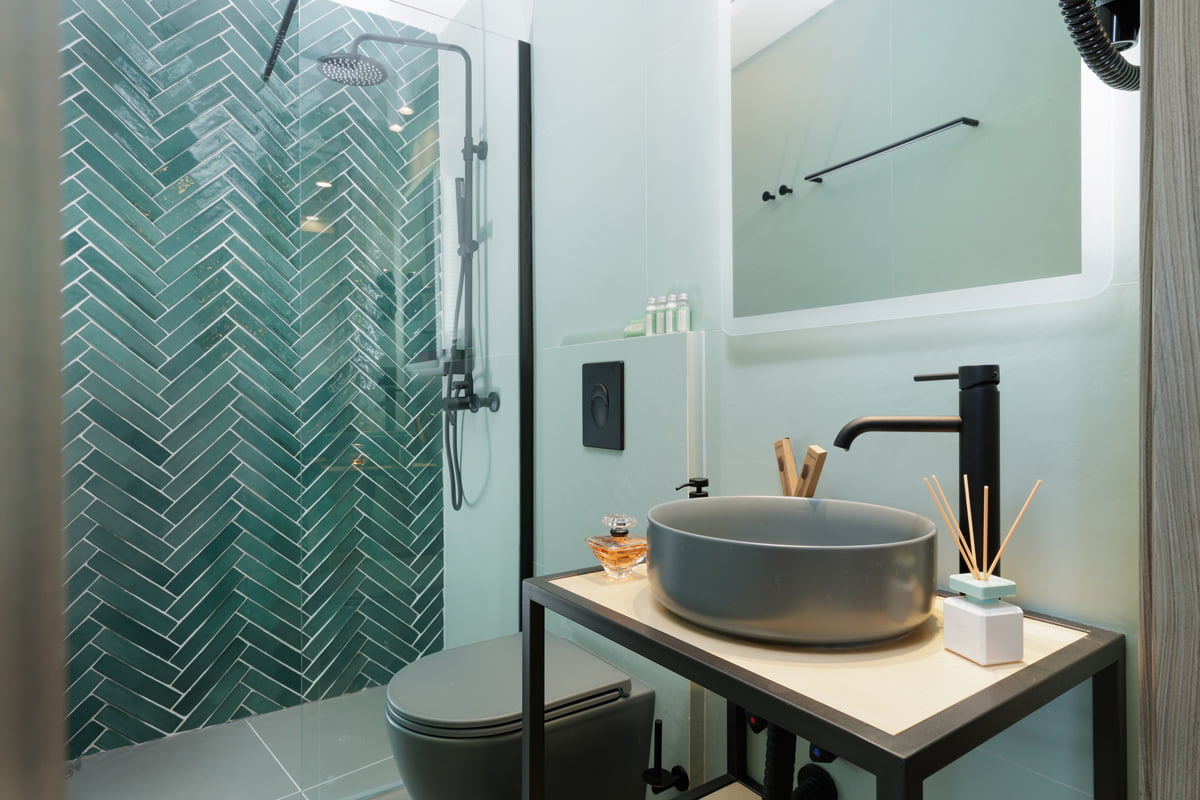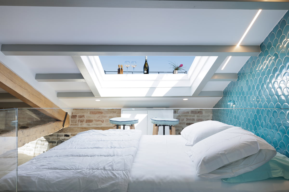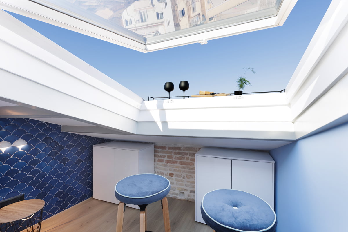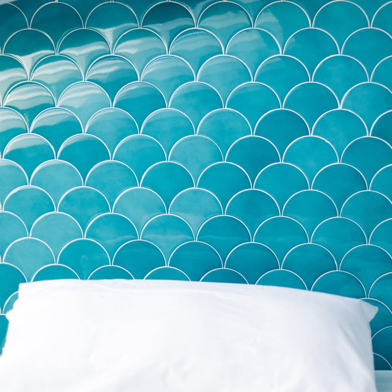 For the Vailato Loft Suites project, luxury apartments located on the island of Corfu (Greece), the Squama Indigo and Emerald series have been used, characterized by their flake shape and blue tones with maritime connotations inspired by the Mediterranean basin. In addition, the use of LED lights in the Box Luz 5"x2,5", a three-dimensional concave-shaped piece, generates a unique aesthetic continuity. And for the bathrooms, the Piastrella Mix series has been used, a white paste cladding with irregular edges and surfaces that provide a handcrafted appearance giving personality to the spaces.