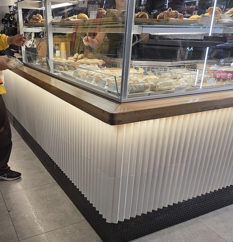This volumetric ceramic tile adds depth, dynamism, and a striking three-dimensional effect, transforming the café's façade into an architectural feature with a strong visual impact.