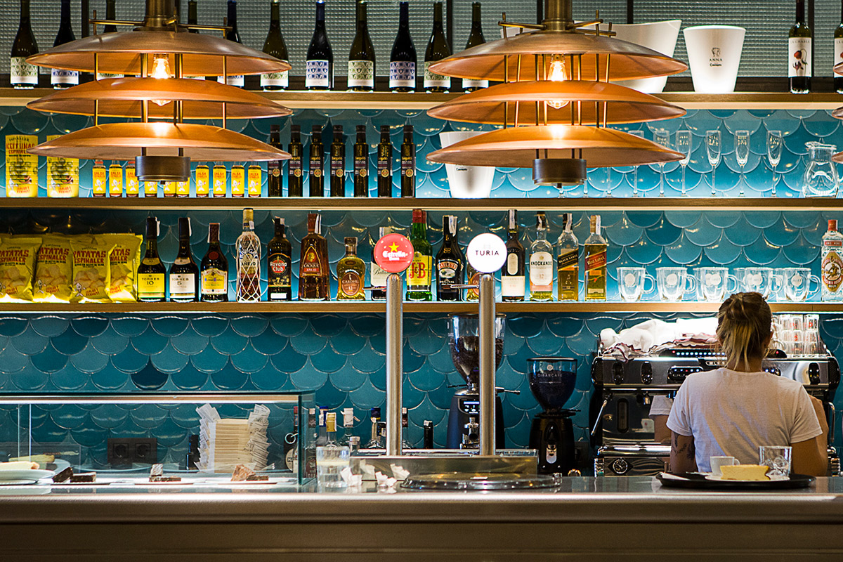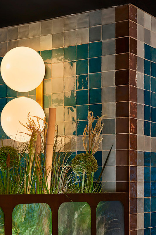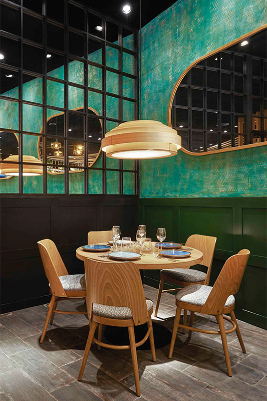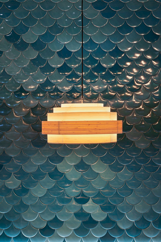 El restaurante cuenta con una terraza y dos grandes salas como comedor interior, además de disponer de una cocina abierta al público. Las paredes de la cocina han sido decoradas con la colección Riad, un revestimiento cerámico con efecto craquelé con forma de escama en color Blanco. Para el frontal de la barra y el pavimento de la sala central se ha utilizado el gres porcelánico en forma de escama de la serie Caprice. El pavimento elegido para el resto de la sala del restaurante y que sirve de nexo de unión entre las salas es la colección Retro Cendra con el formato 21x60 completando una escena muy cálida y acogedora, que recuerda la cubierta de un barco antiguo.