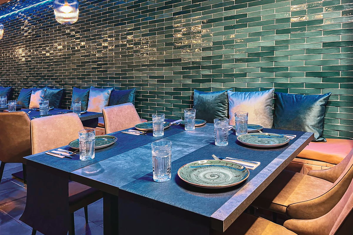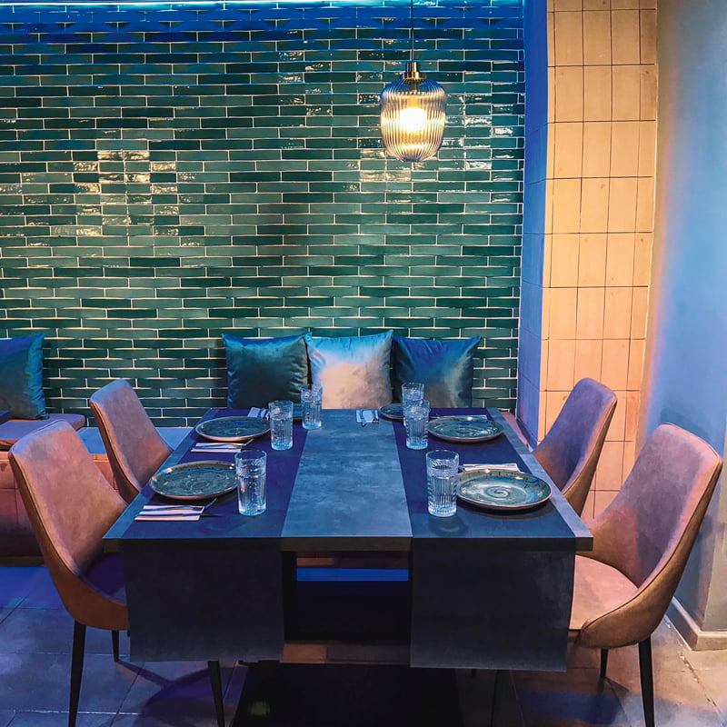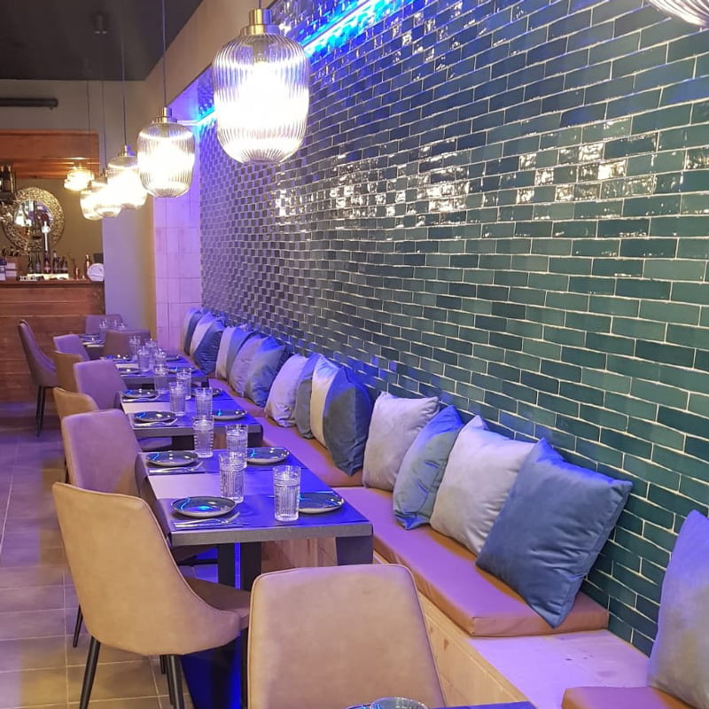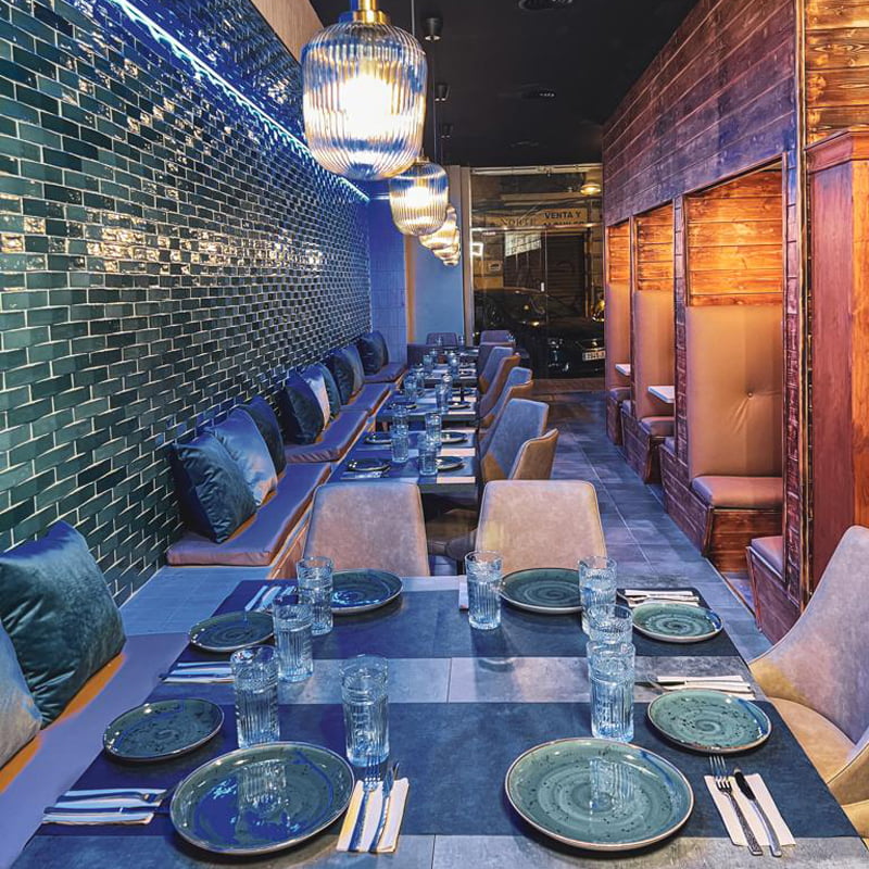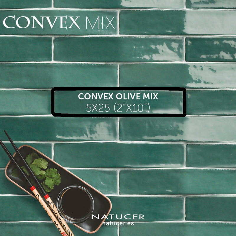 Para la apertura de La Bodeguita del Centro , un nuevo restaurante en Valencia que combina diferentes estilos tanto gastronómicos como de diseño, han utilizado Convex Olive Mix 5x25, un revestimiento con volumen tridimensional y superficie brillo ofreciendo una apariencia peculiar y majestuosa. Se ha usado el verde, un color fresco vinculado con la naturaleza y la necesidad de contacto con el exterior. Y para rebajar la intensidad de los colores fríos, se han usado colores cálidos en las sillas para que el ambiente respire equilibrio.