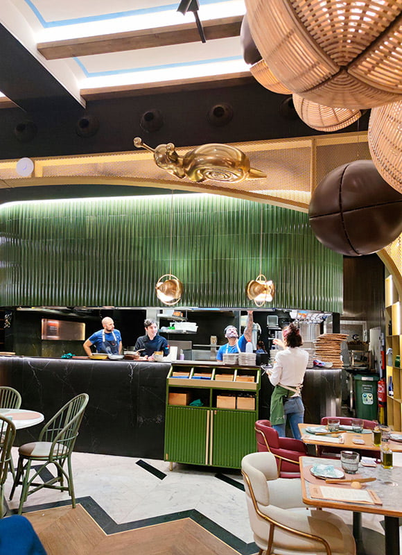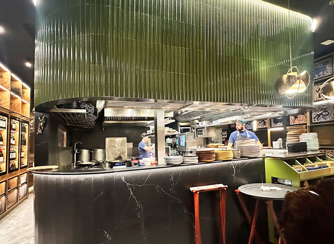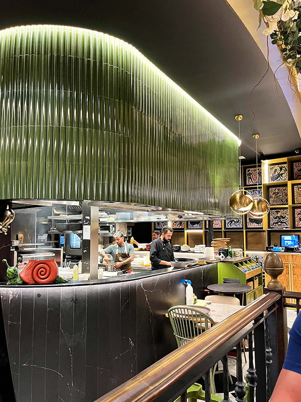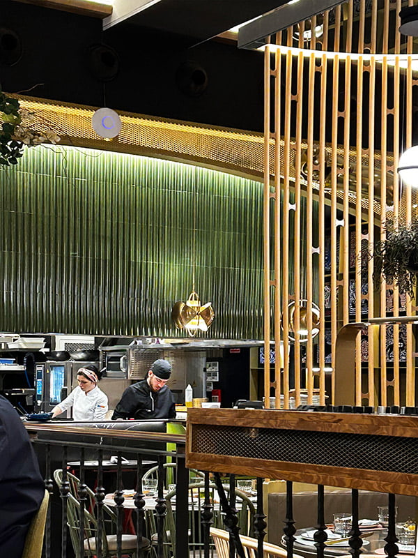 Un diseño espectacular comienza con los mejores materiales. ✨ La colección DYNAMIC ANGLE LUX&TWO transforma la barra de este restaurante con su acabado brillo en color GREEN y formato 12,5x30 cm. Su diseño moderno y dinámico se integra a la perfección con la iluminación y el mobiliario, creando un ambiente sofisticado y único.