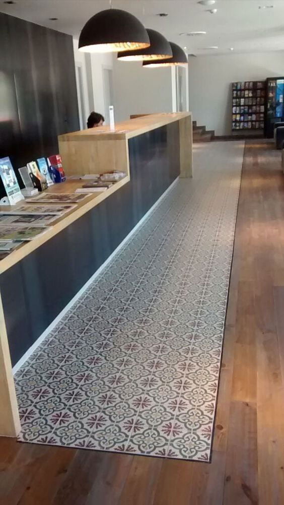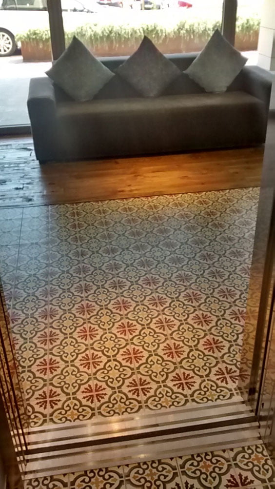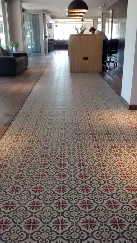 En esta ocasión el material utilizado es la baldosa Centro Quatro Trab de la serie Cementi, una pieza de hidráulico cerámico con una distintiva forma.