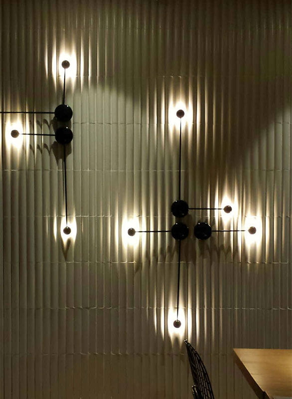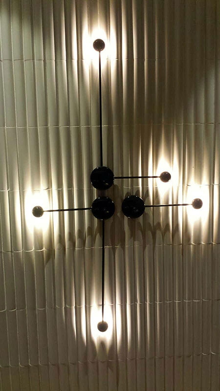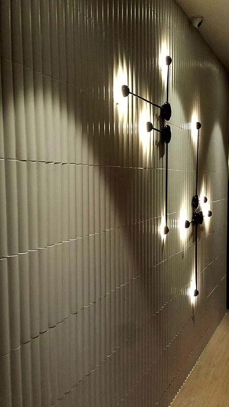 El equipo de María Villalón Studio, ha confiado en Natucer para revestir las paredes del local, seleccionando la pieza Arch dentro de la colección Dynamic. El volumen y diseño geométrico de estas piezas cerámicas, en combinación con las luces del local, otorgan a las paredes de este, un aspecto dinámico y cautivante, a la vez que aportan profundidad en función de la perspectiva e incidencia de la luz de cada momento.