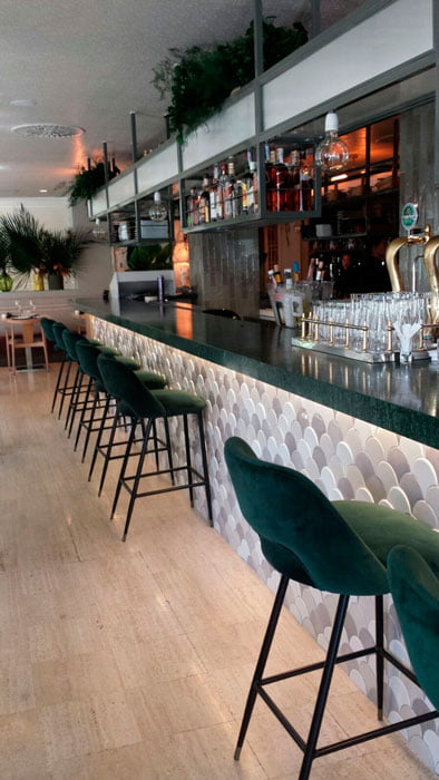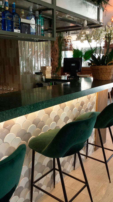 Ha sido decorado por el estudio "Nebo Interiosimo" que ha utilizado las colecciones Riad, presente en el frontal de la barra, y Manhattan para el revestimiento de la pared.
