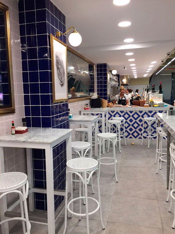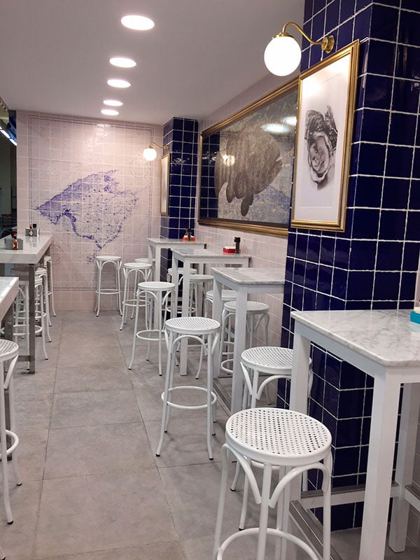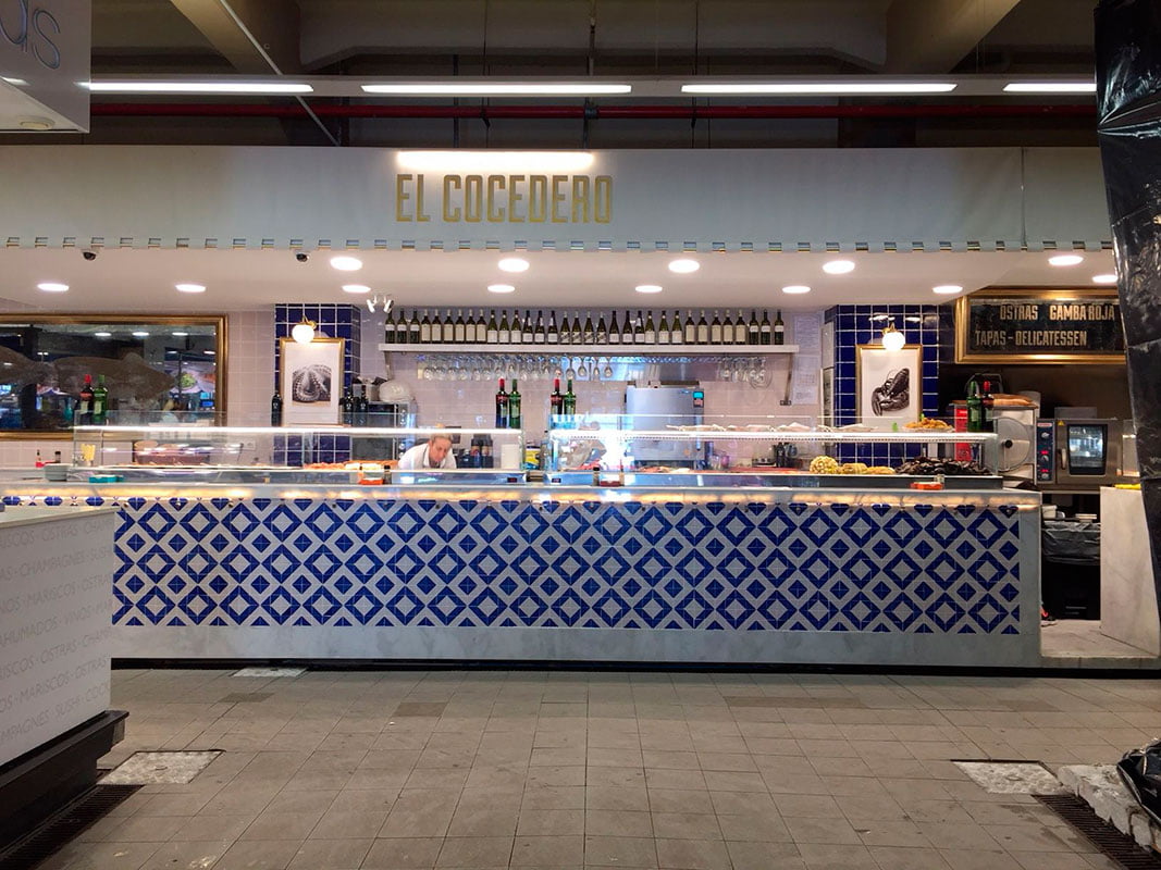 En el mercado del Olivar situado en Palma de Mallorca se encuentra la marisquería El Cocedero. Un espacio donde disfrutar de buenos manjares tipos de la zona. El color, diseño y formato, proporciona la serie Novecento de Natucer otorgan un aire marítimo al local.