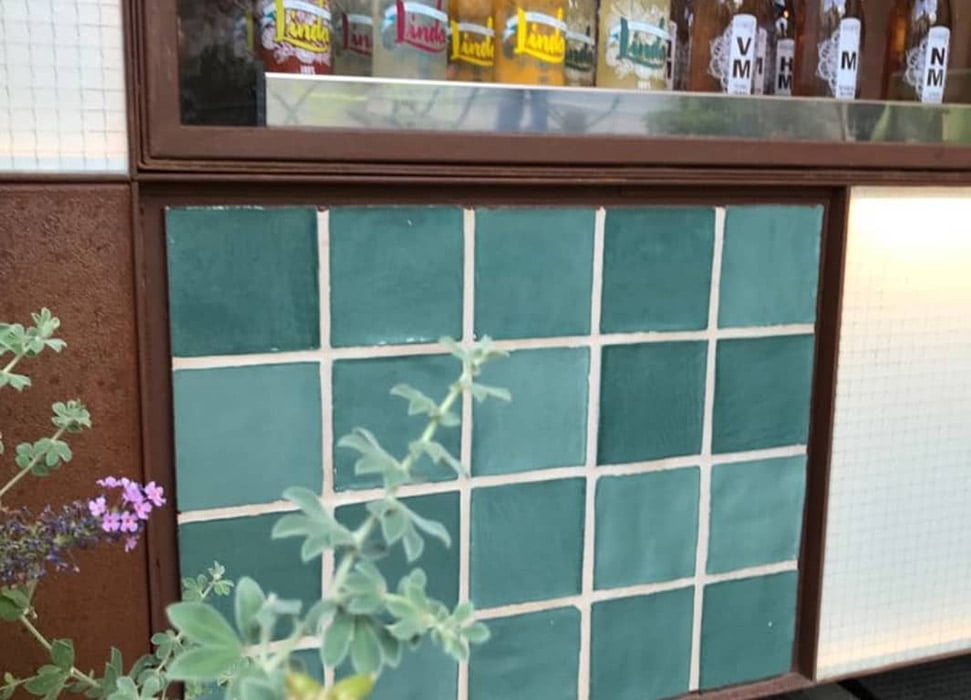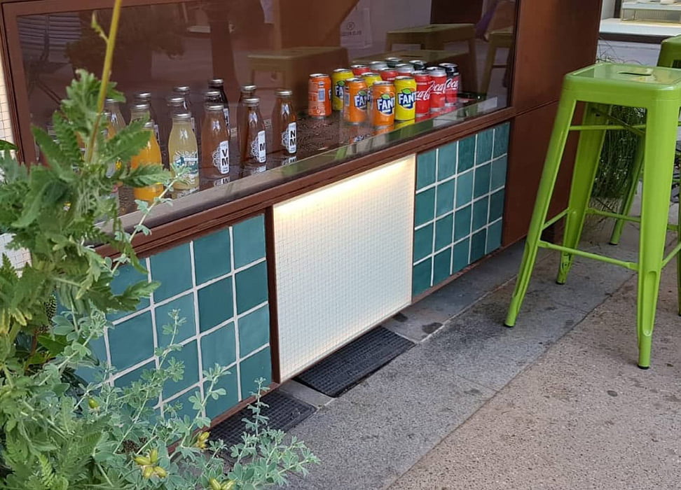La empresa Plecoart ha sido la encargada de realizar el proyecto, confiando en Natucer para decorar el kiosko del restaurante IZKY con la serie Stow en su formato de 10x10 con color Mix Turchese.