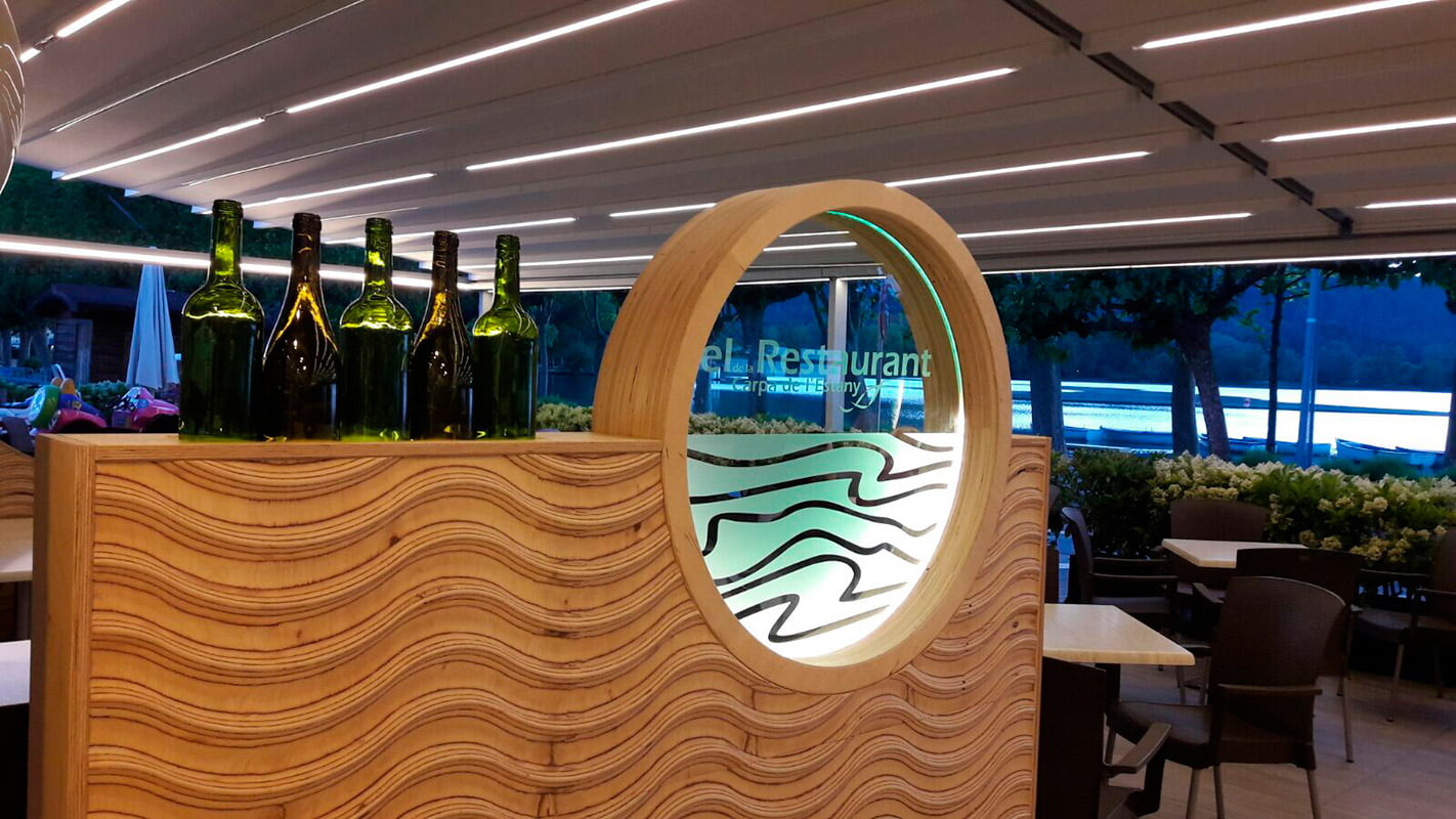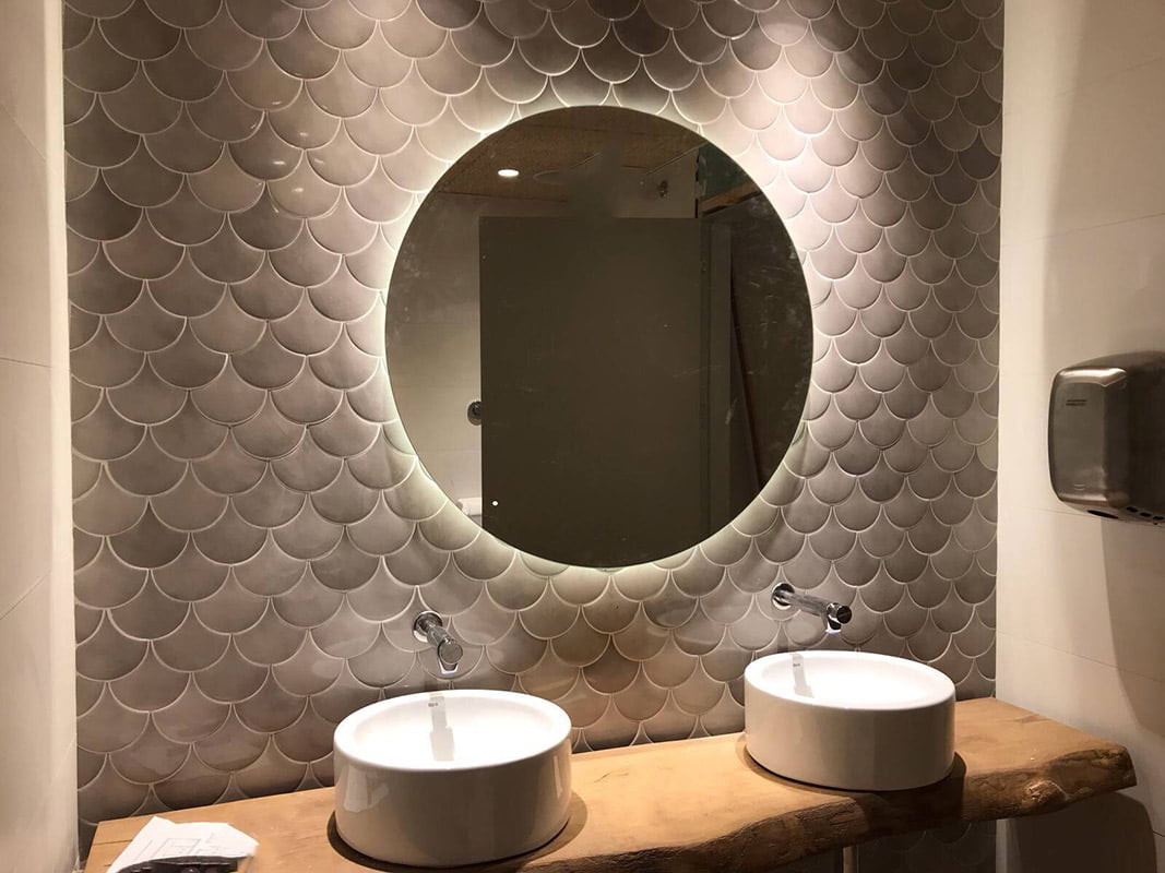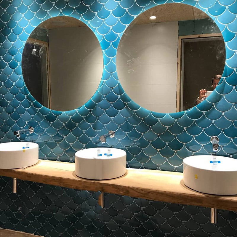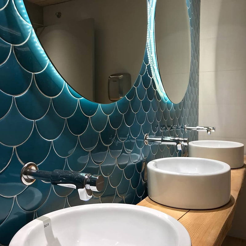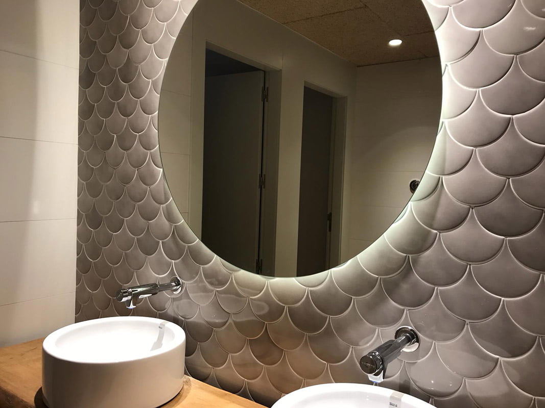 La empresa Risques Arquitectes ha sido encargada de decorar el restaurante La Carpa situado en Banyoles. La serie Squama con los colores Emeralad y Mist de Natucer ha sido el material cerámico elegido para resvestir las paredes de los cuartos de baño con suma elegancia. La forma que presenta la serie, recuerda a las escamas de pez, generando un efecto lleno de dinamismo en el espacio. Una mezcla de sofisticación y vanguardia que caracteriza el estilo del local.
