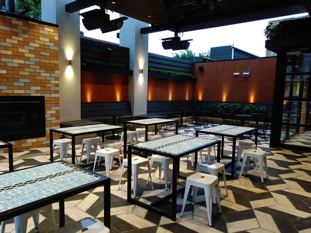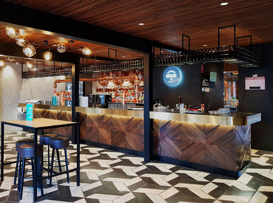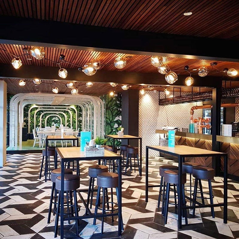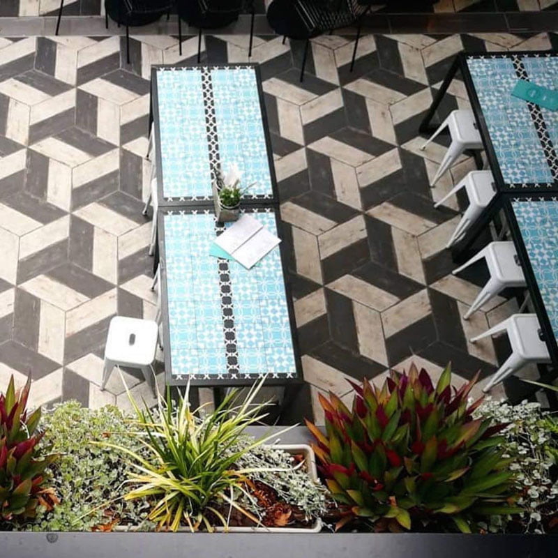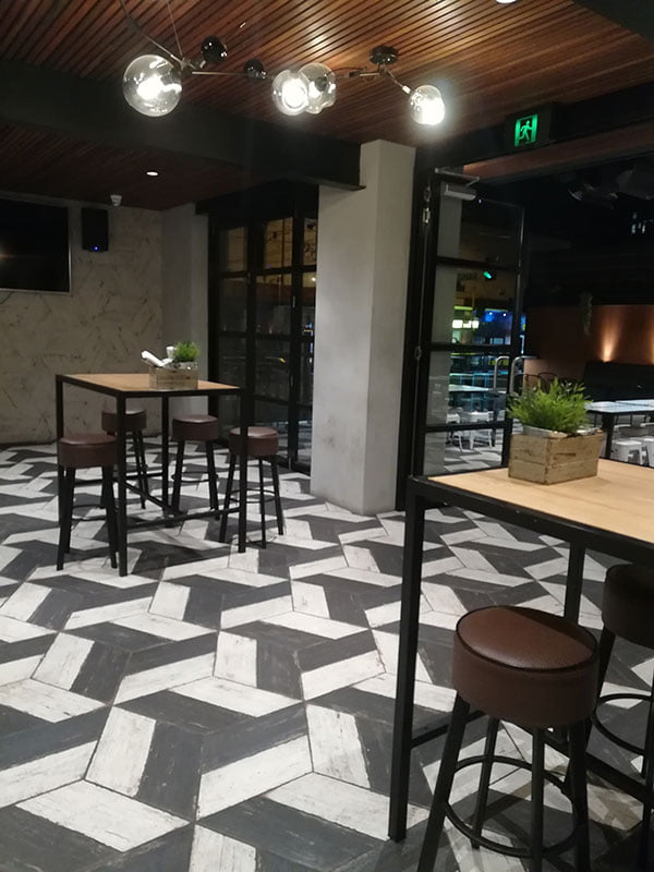 La luz que reina en todo el espacio, ensalza los diferentes elementos como es el color del pavimento de la serie Retro combinando a la perfección con la decoración del local.